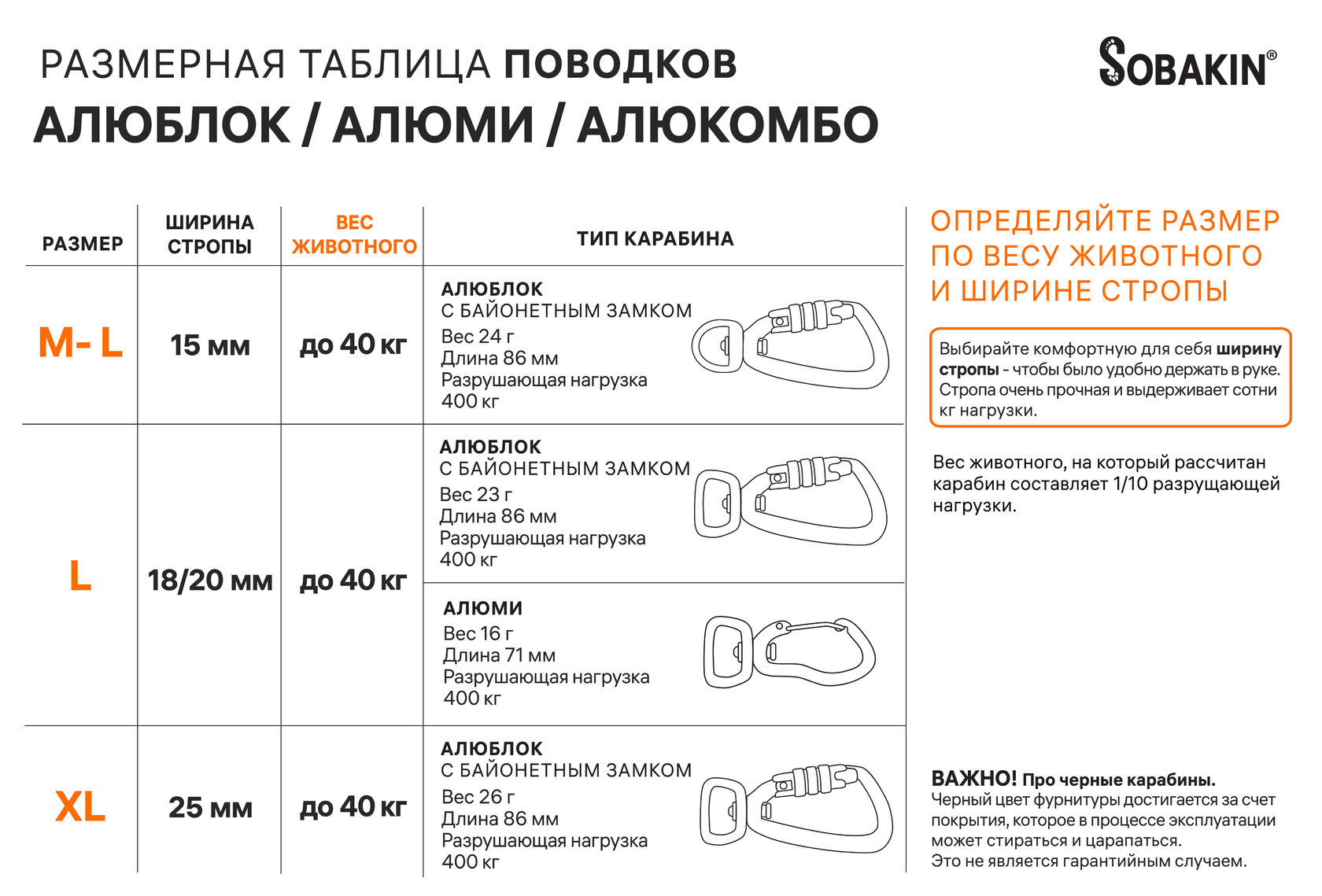 В поводках-трансформерах 7 в 1 АЛЮБЛОК применяются карабины: - ЛЕГКИЕ: выполненные из облегченного авиационного алюминия. Они существенного легче, чем обычные рычажные карабины, рассчитанные на аналогичный вес. - с АВТОБЛОКИРОВКОЙ. Сами не могут расстегнуться. Чтобы расстегнуть такой карабин, нужно повернуть небольшую муфточку и нажать на рычаг. - НАГРУЗКА более 40 кг. Разрывная нагрузка у такого карабина - свыше 400 кг, а рабочая (то есть вес Собаки) - около 40 кг.
